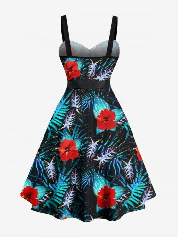 Plus Size Hibiscus Flower Tropical Leaf Print Buttons Turn Down Collar Hawaii Dress With Belt - Noir - Noir