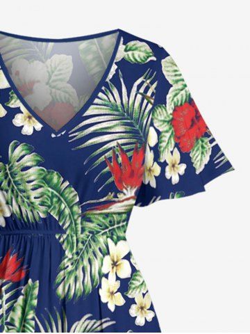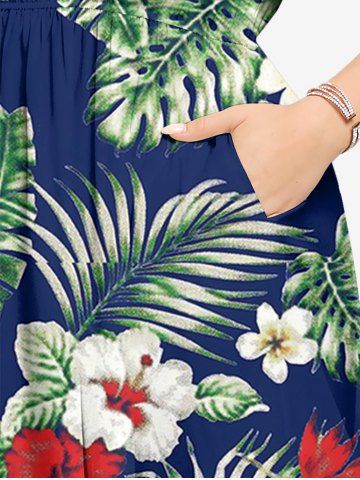 Plus Size Hibiscus Flower Tropical Leaf Print Split Hawaii Cami Dress - Bleu Profond - 5x