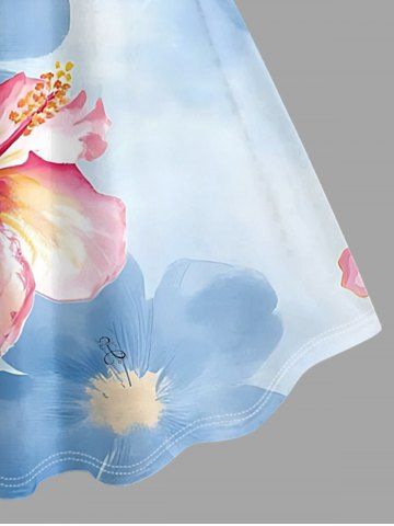 Plus Size Hibiscus Flower Watercolor Print Hawaii Tank Dress - Bleu Poudre - M