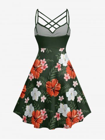 Robes Graphiques > Plus Size Hibiscus Flowers Leaf Print Ruched Lattice Crisscross Straps Hawaii Dress