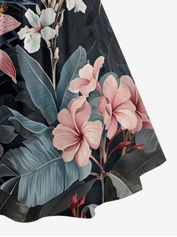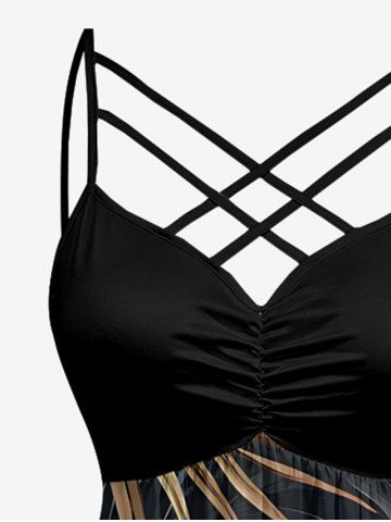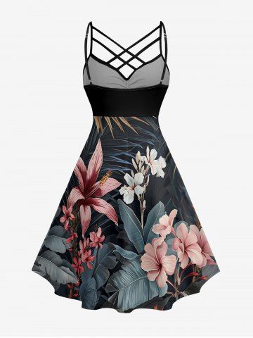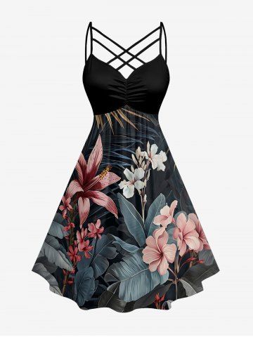 Plus Size Hibiscus Flowers Leaf Print Ruched Lattice Crisscross Straps Hawaii Dress - Noir - Noir