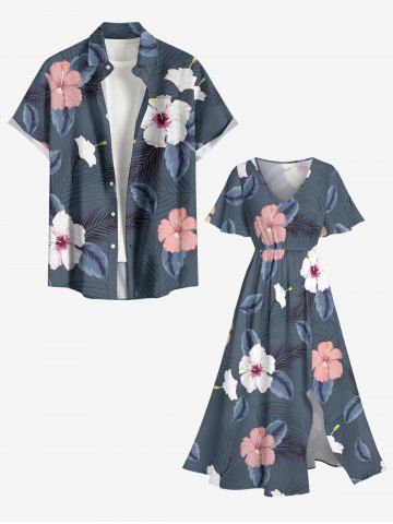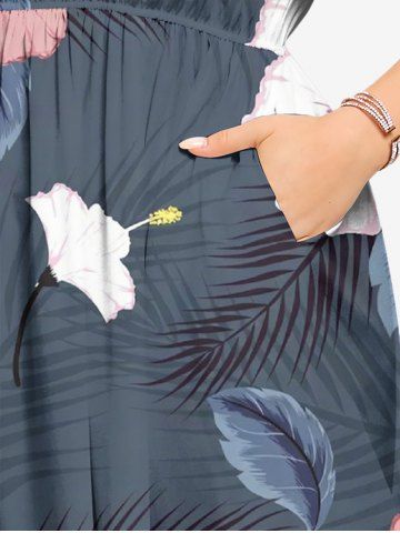 Plus Size Hibiscus Flowers Tropical Leaf Print Split Hawaii Midi Dress - Bleu-gris - M