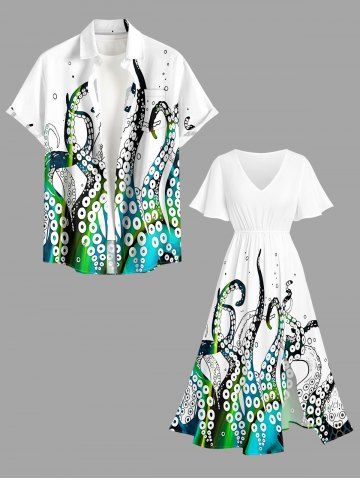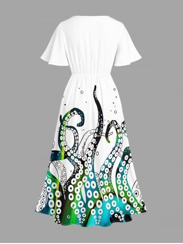 Plus Size Octopus Print Hawaii Split Pocket A Line Midi Dress - Blanc - Blanc