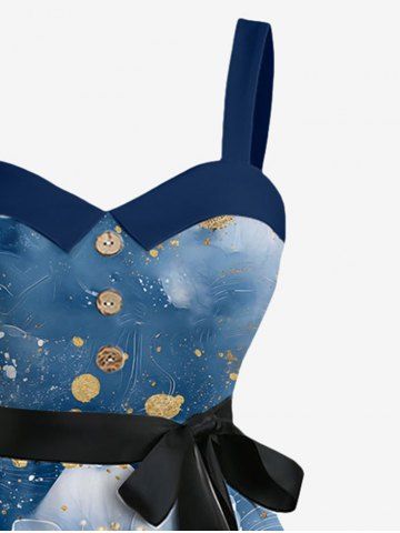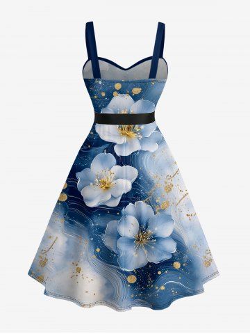 Plus Size Ombre Flower Galaxy Print Hawaii Button A Line Dress with Removable Belt - Bleu Profond - 3x