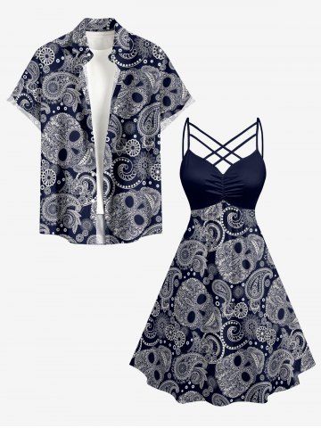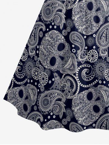 Plus Size Paisley Floral Skull Print Ruched Lattice Crisscross Straps Hawaii Dress - Bleu Profond - 5x