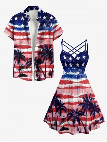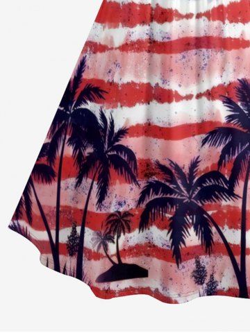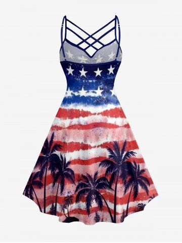 Robes Graphiques > Plus Size Patriotic American Flag Coconut Tree Tie Dye Print Ruched Lattice Crisscross Straps Dress
