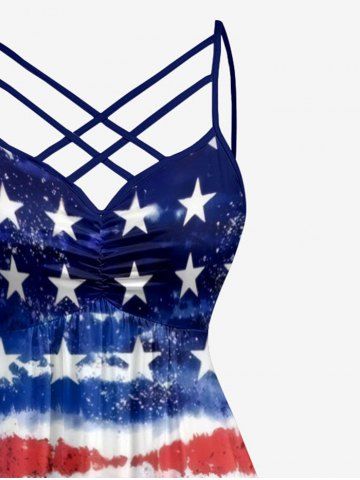 Plus Size Patriotic American Flag Coconut Tree Tie Dye Print Ruched Lattice Crisscross Straps Dress - Bleu - Bleu