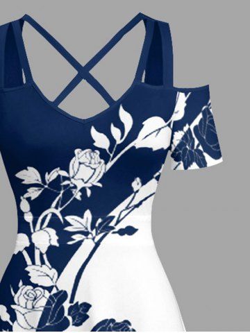 Plus Size Rose Flower Colorblock Print Cold Shoulder Crisscross Hawaii Maxi Dress - Bleu Profond - 4x