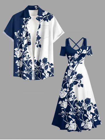 Robes Graphiques > Plus Size Rose Flower Colorblock Print Cold Shoulder Crisscross Hawaii Maxi Dress