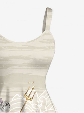 Plus Size Shark Cat Octopus Sea Waves Print Hawaii A Line Dress - Blanc De Crème - M