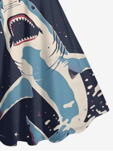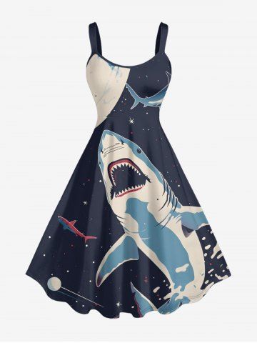 Plus Size Shark Planet Plane Galaxy Print Hawaii A Line Dress - Bleu De Minuit - 1x