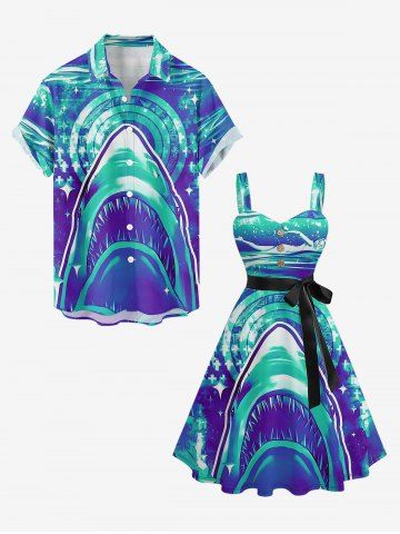Robes Graphiques > Plus Size Shark Sea Print Hawaii Button A Line Dress with Removable Belt
