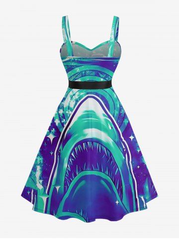 Plus Size Shark Sea Print Hawaii Button A Line Dress with Removable Belt - Bleu - Bleu
