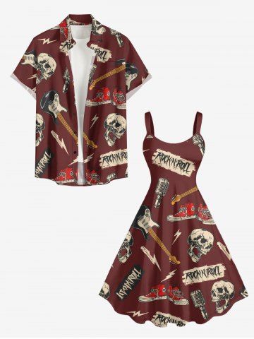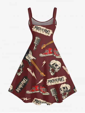 Plus Size Skull Guitar Shoes Microphone Print Hawaii Tank Dress - Rouge Vineux - M