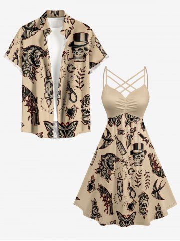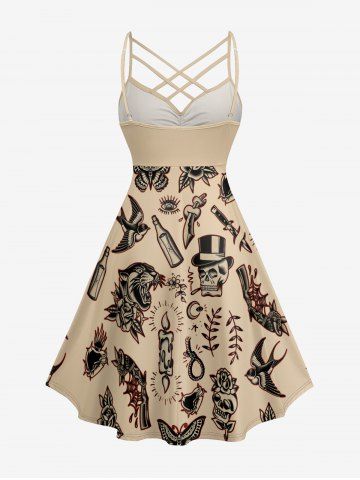 Plus Size Skull Leopard Bird Candle Ring Print Ruched Lattice Crisscross Straps Hawaii Dress - Bronze - S