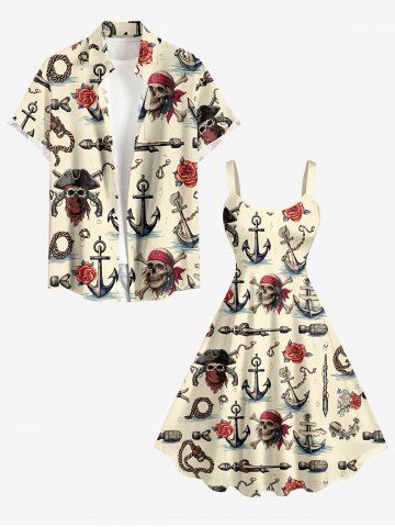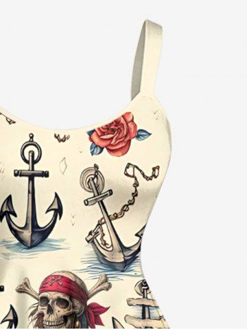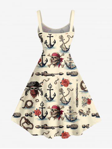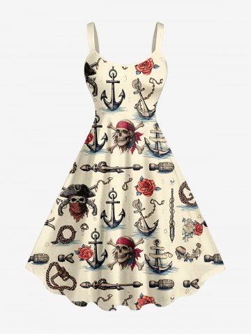 Plus Size Skull Pirate Rose Flower Anchor Print Hawaii Tank Dress - Beige - Ral1001beige