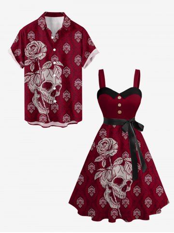 Plus Size Skull Rose Flower Leaf Print Hawaii Button A Line Dress with Removable Belt - Rouge Foncé - 1x