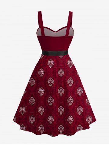 Plus Size Skull Rose Flower Leaf Print Hawaii Button A Line Dress with Removable Belt - Rouge Foncé - 3x