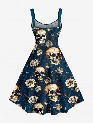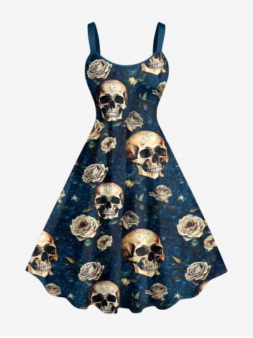 Plus Size Skull Rose Flower Print Hawaii Tank Dress - Paon Bleu - L