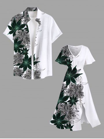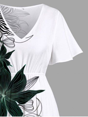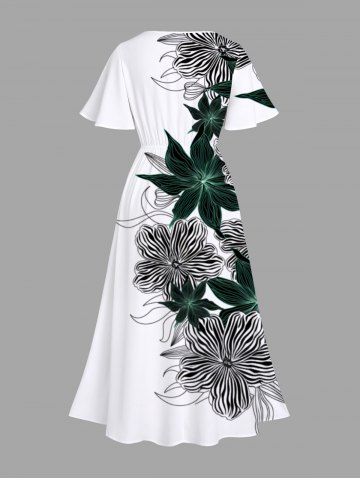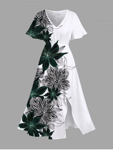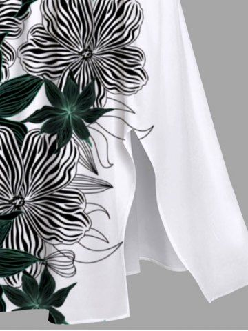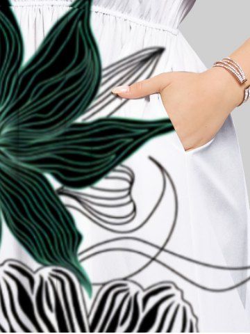 Plus Size Striped Floral Print Hawaii Split Pocket A Line Midi Dress - Blanc - Blanc
