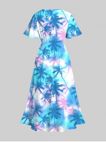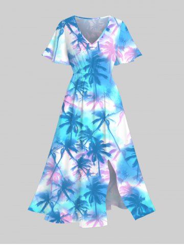 Plus Size Tie Dye Ombre Tropical Coconut Tree Print Split Hawaii Midi Dress - Bleu - Bleu