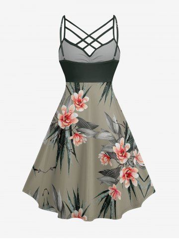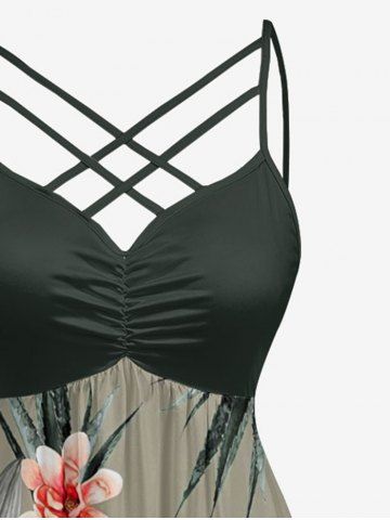 Plus Size Tropical Leaf Flower Print Hawaii Ruched Crisscross Strappy A Line Cami Dress - Vert Profond - 2x