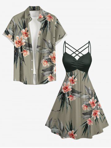 Robes Graphiques > Plus Size Tropical Leaf Flower Print Hawaii Ruched Crisscross Strappy A Line Cami Dress