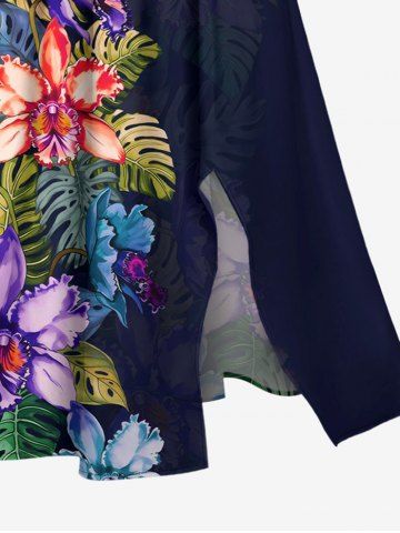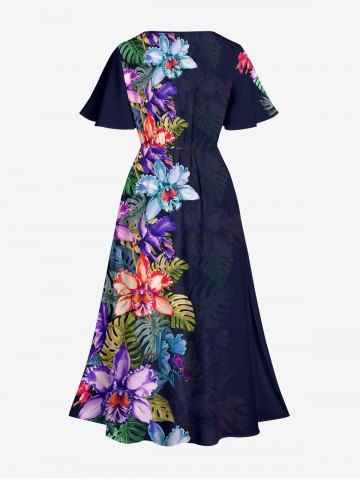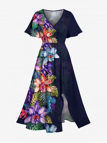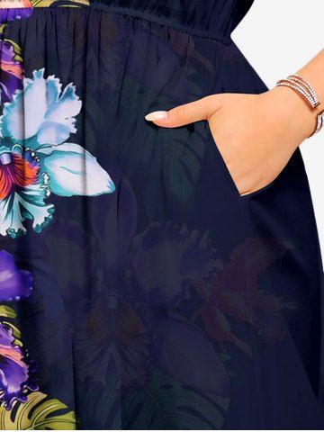 Plus Size Tropical Leaf Flower Print Hawaii Split Pocket A Line Midi Dress - Bleu Profond - 1x