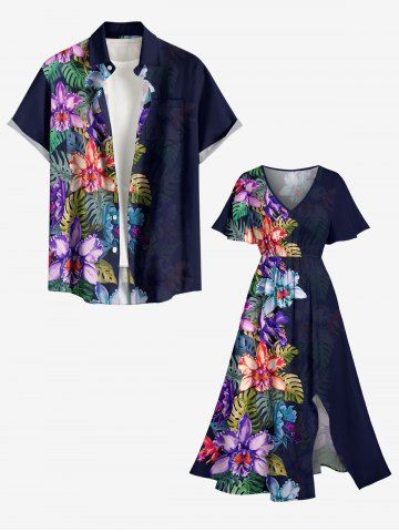 Plus Size Tropical Leaf Flower Print Hawaii Split Pocket A Line Midi Dress - Bleu Profond - 2x
