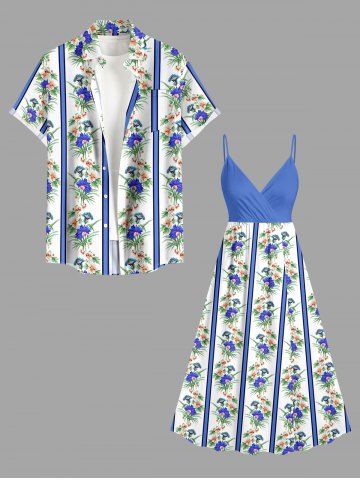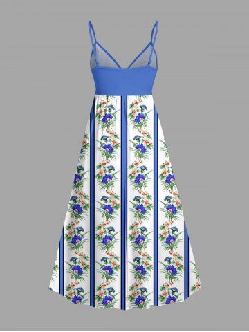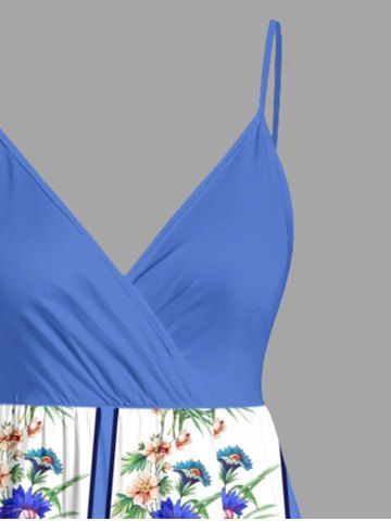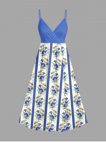 Plus Size Tropical Leaf Flower Striped Print Hawaii Surplice A Line Cami Dress - Bleu Ciel - Bleu Ciel