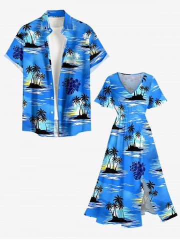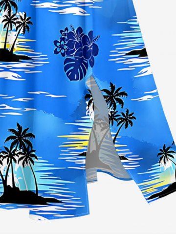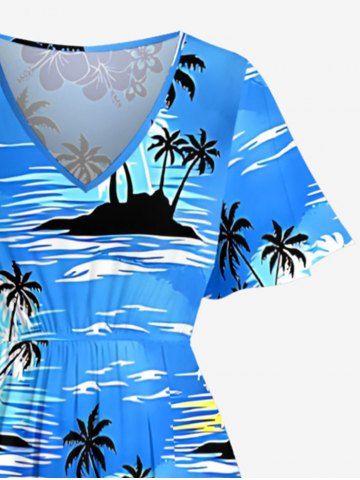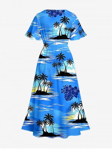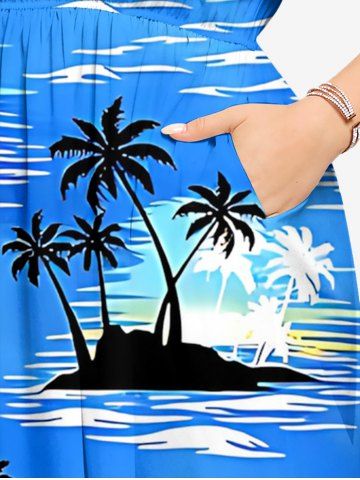 Plus Size Tropical Leaf Hibiscus Flower Coconut Tree Sea Print Hawaii Split Pocket A Line Midi Dress - Bleu Ciel - Bleu Ciel
