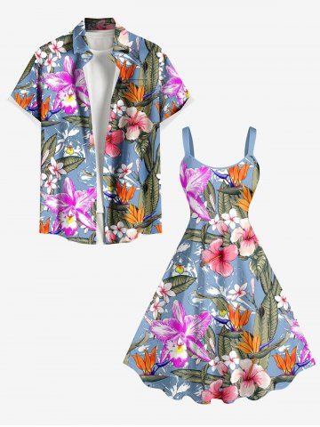 Plus Size Tropical Leaf Hibiscus Flower Print Hawaii A Line Dress - Bleu Poudre - 1x