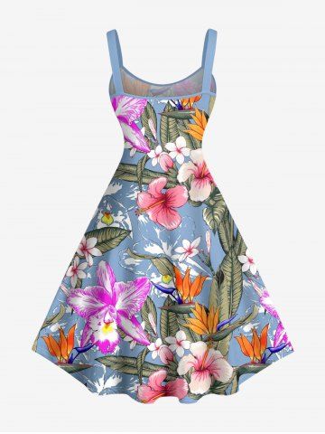 Plus Size Tropical Leaf Hibiscus Flower Print Hawaii A Line Dress - Bleu Poudre - 4x