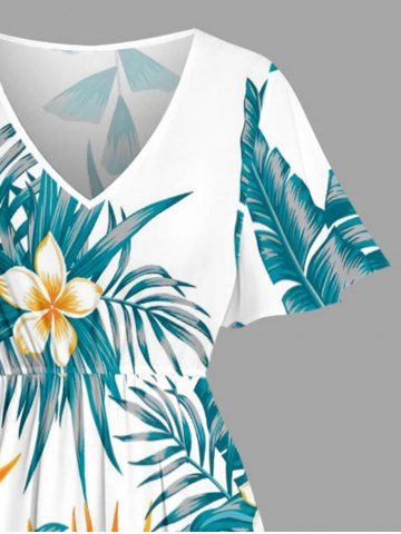 Plus Size Tropical Leaf Hibiscus Flower Print Hawaii Split Pocket A Line Midi Dress - Turquoise Foncée - 4x