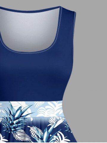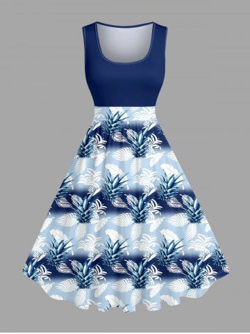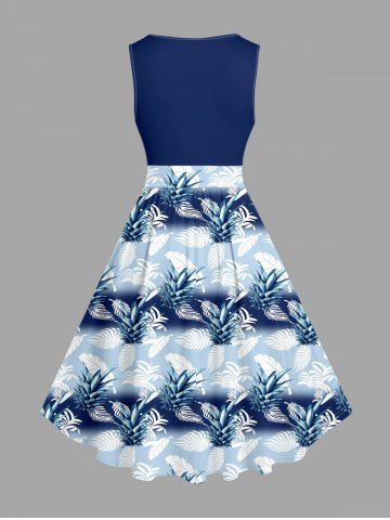 Plus Size Tropical Leaf Print Hawaii 1950s Vintage Dress - Bleu Profond - 2x