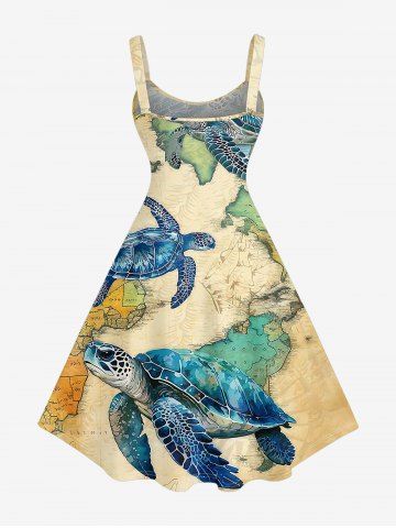 Plus Size Turtle Map Print Hawaii Sea Creatures A Line Dress - Café Lumière - 2x