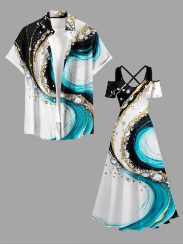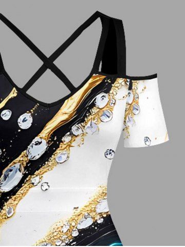 Plus Size Water Ripple Curve Diamond Print Hawaii Cold Shoulder Crisscross A Line Maxi Dress - Blanc - Blanc
