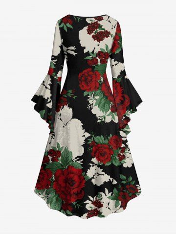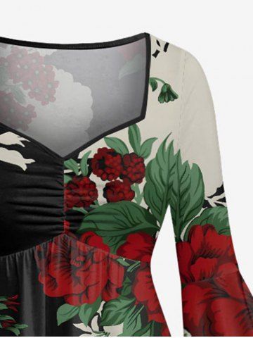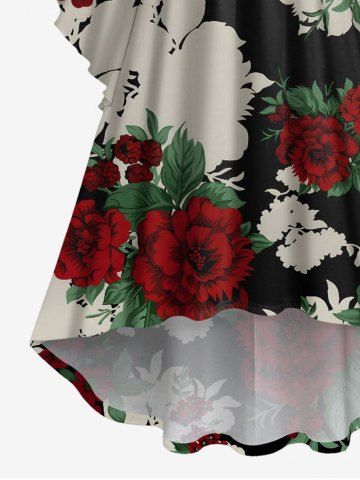 Robe asymétrique froncée à imprimé floral et feuilles grande taille - Noir - Noir