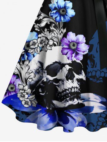 Robe débardeur trapèze grande taille à imprimé tête de mort, fleurs et branches, style hawaïen, boutonnée et rabattue, avec ceinture amovible - Noir - Noir