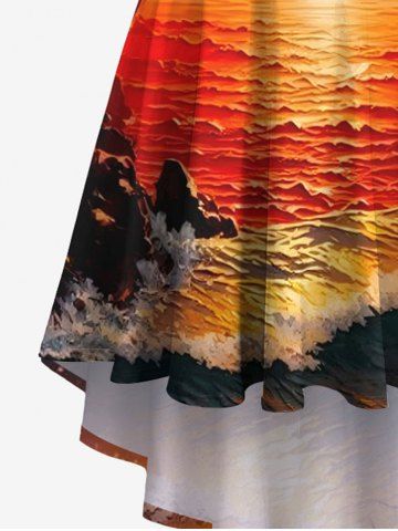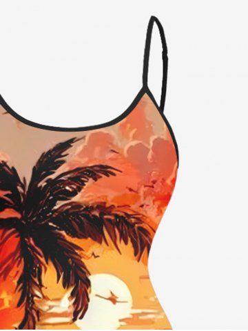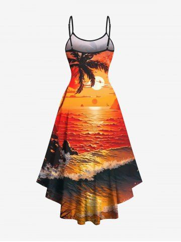 Robe camisole hawaïenne grande taille à imprimé paysage marin, cocotier, soleil, oiseaux et nuages - Orange - Orange