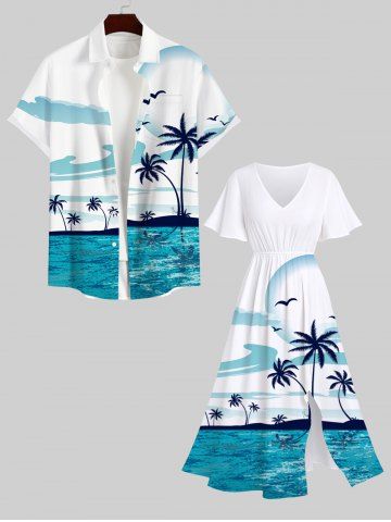 Seascape Coconut Tree Seagull Cloud Tropical Print Plus Size Matching Hawaii Beach Outfit For Couples