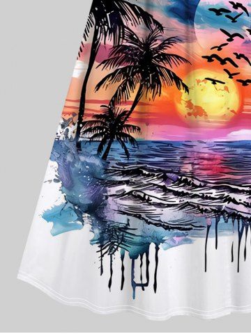 Plus Size Watercolor Sea Coconut Tree Sun Cloud Bird Print Surplice Hawaii Cami Dress