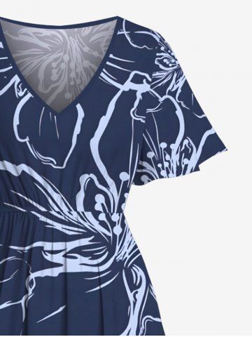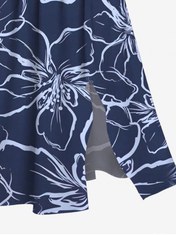 Robe D'Hawaii Mi-Longue Fendue Fleur D'Hibiscus et Peinture Imprimés de Grande Taille - Bleu - Bleu