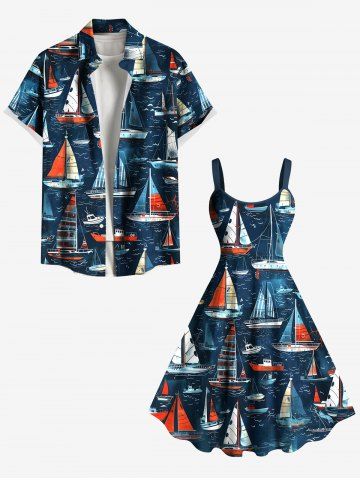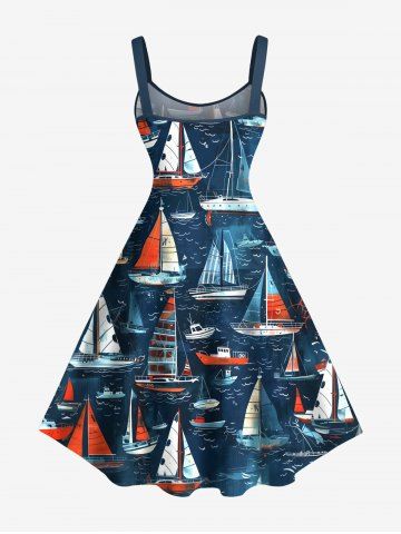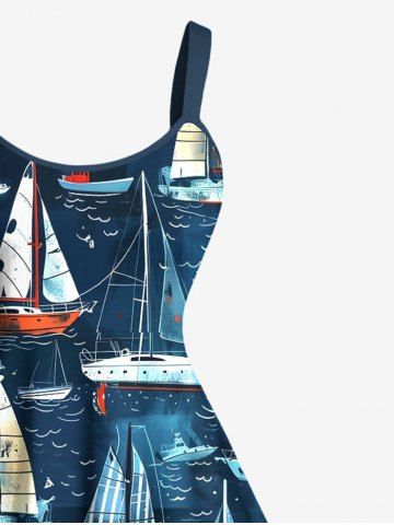 Robe de Bal Grande Taille Imprimée Hawaï Voilier et Vague de Mer - Bleu Profond - Xxs