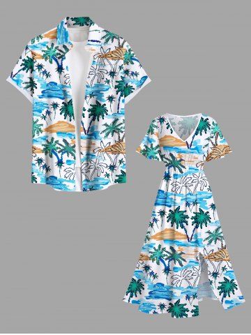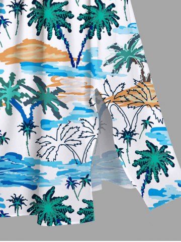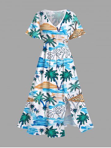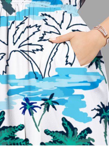 Robe de Plage Hawaïen Mi-Longue Vague de Mer et Arbre Noix de Coco Imprimés de Grande Taille - Bleu Clair - Bleu Clair