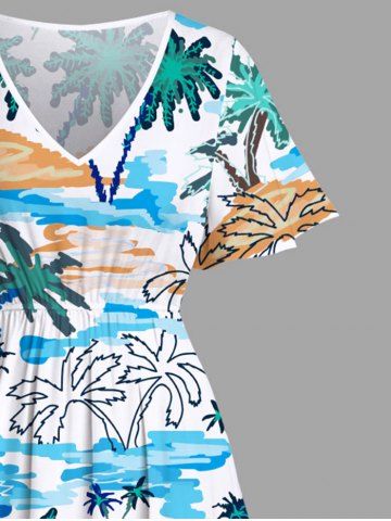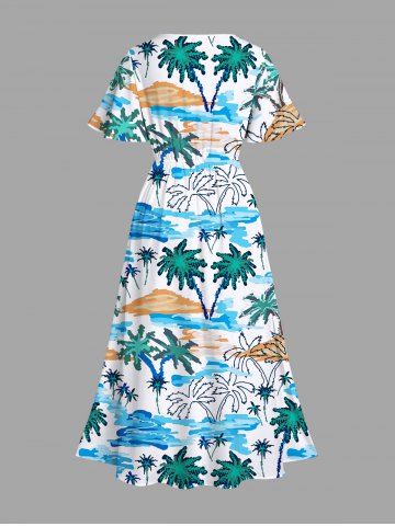 Robe de Plage Hawaïen Mi-Longue Vague de Mer et Arbre Noix de Coco Imprimés de Grande Taille - Bleu Clair - Bleu Clair