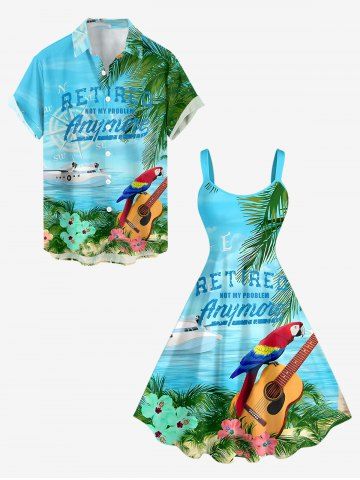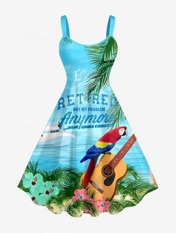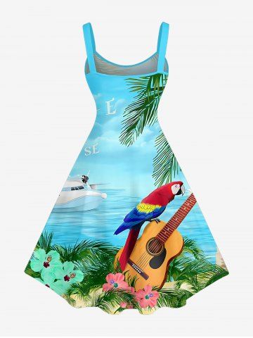 Robe débardeur grande taille à imprimé fleurs, cocotier, perroquet, guitare, paysage marin et hors-bord, style hawaïen - Bleu Ciel - Bleu Ciel