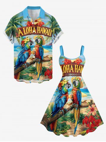 Robes Graphiques > Robe débardeur grande taille à imprimé perroquets, hibiscus, feuilles et paysage marin, style hawaïen