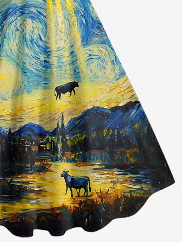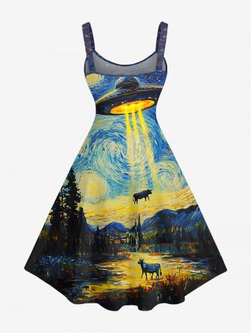 Robes Graphiques > Robe débardeur grande taille à motif peinture à l'huile, lune, OVNI, vaches et montagne, style hawaïen