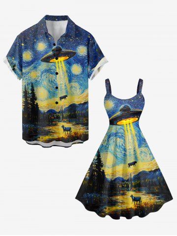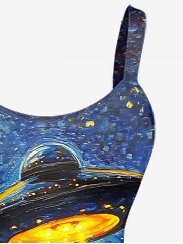 Robe débardeur grande taille à motif peinture à l'huile, lune, OVNI, vaches et montagne, style hawaïen - Bleu - Bleu